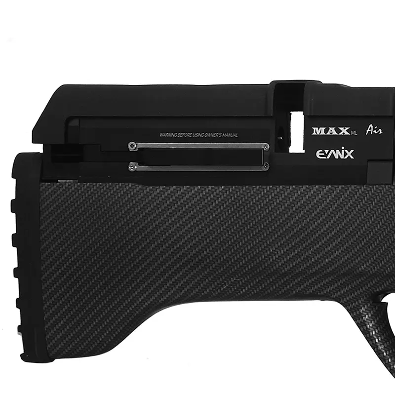قنداق این تفنگ با طراحی ارگونومیک و از جنس پلیمر با کیفیت ساخته شده که ضمن سبکی، استحکام بالایی دارد. همچنین مجهز به ریسمان ایمنی و پایه دوربین (ریل ۱۱ میلیمتری) برای نصب انواع optics است. این تفنگ برای شارژ به پمپ دستی یا کپسینگ هوا نیاز دارد و با حداکثر فشار کاری ۲۰۰ بار، تعداد شلیک قابل توجهی در هر بار شارژ ارائه میدهد. اوانیکس مکس ایر انتخابی ایدهآل برای شکارچیان حرفهای و علاقهمندان به تیراندازی رقابتی است.